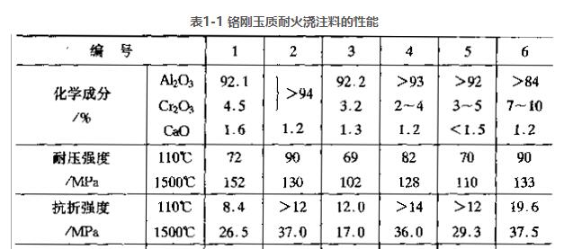 表1-1是鉻剛玉耐火澆注料的性能。表中1號(hào)材料以板狀剛玉為耐火骨料,電熔白剛玉為粉末。2號(hào)以致密剛玉為耐火骨料和粉末。其余采用電熔白剛玉為耐火骨料和粉末。耐火骨料的臨界粒徑為10mm或8mm,總用量約為70%;同時(shí),A-Al2O3起微粉、工業(yè)氧化鉻和少量UF-SiO2也被用作耐火粉。編號(hào)5以CA-80水泥為結(jié)合劑,其余為CA-70水泥。同時(shí)加入減水劑和緩凝劑。從表中可以看出,Al2O3和Cr2O3的含量大于94%,材料的純度非常高。體積密度大于3.10g/cm3,材料致密。110℃干燥和1500℃燃燒后,耐壓強(qiáng)度分別大于69mpa和102mpa。除編號(hào)1外,1500℃燃燒后線變化為負(fù)值,即略有收縮。總之,高純度鉻剛玉耐火澆注料性能優(yōu)異。